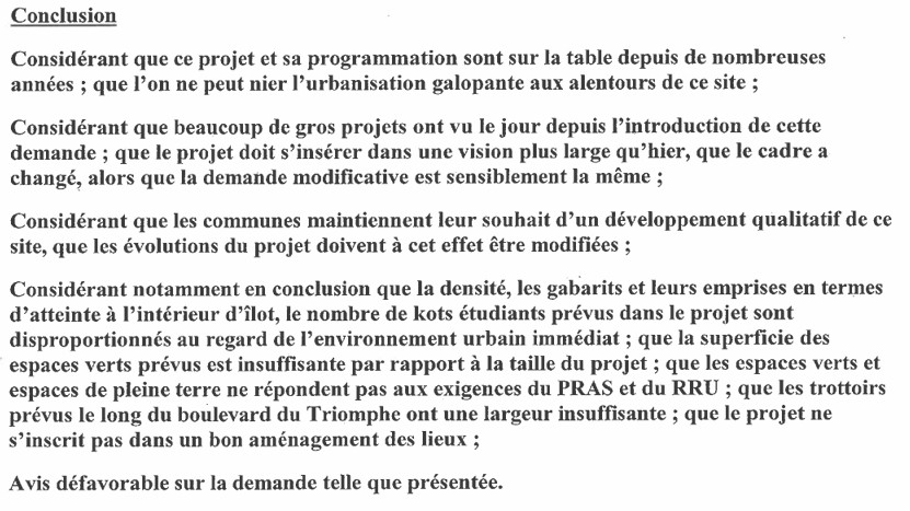 Si cet avis est majoritairement favorable à l’octroi du permis, sous conditions, le Comité et les riverains saluent l’avis étayé rendu à l’encontre de ce permis par leurs communes d’Auderghem et d’Ixelles.